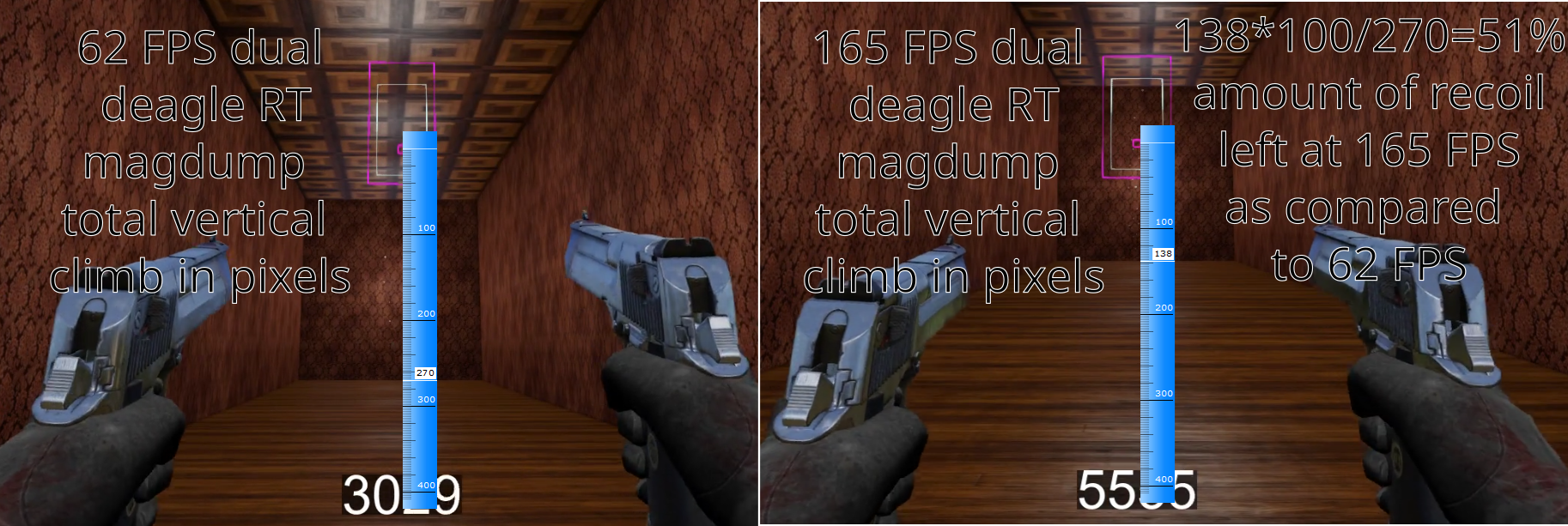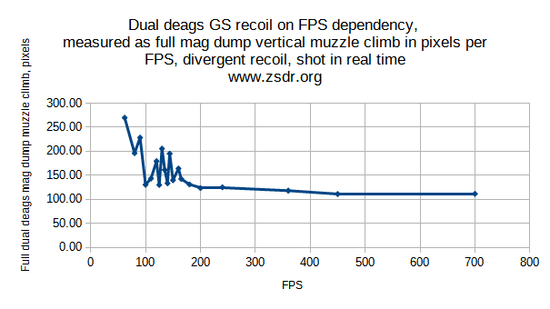 Pixels measure the total vertical muzzle climb in real time which results from the uncontrolled recoil after a full mag dump of the dual “Desert Eagle” pistols by the crouching still gunslinger. The climb in pixels is averaged and the function of the recoil climb dependency on FPS is built. As you can see, the recoil goes down very quickly and at mere 100 FPS deteriorates almost twice, reducing the recoil by half.