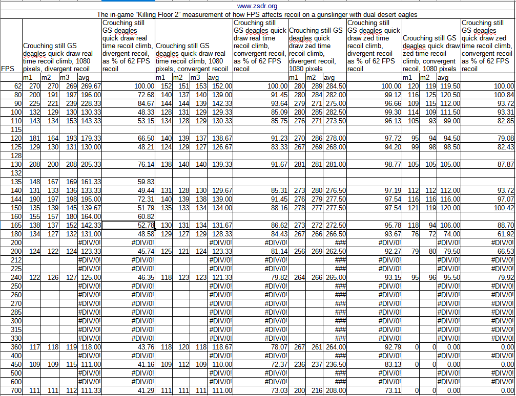 - There are FPS values where recoil actually increases, both in real time and zed time, sometimes above the “nominal” value of the 62 FPS, all these values are at <200 FPS range, the overall graph shape is “sawtooth”-like, which is similar to other games that have this issue;