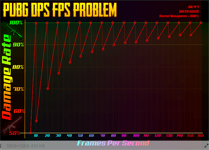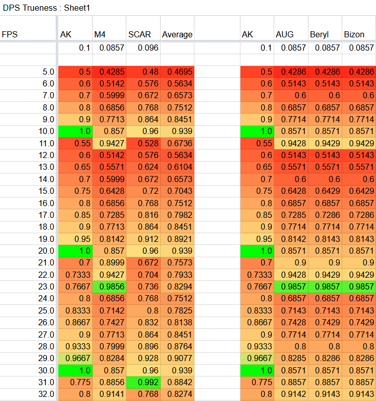 As you can see, it’s a very similar sawtooth-shaped graph to the ones I’ve produced above. The only difference is it’s reverse here, as this graph’s author reports DPS on the Y axis, while I do the vertical recoil pixels. The spreadsheet the PUBG players rely on: